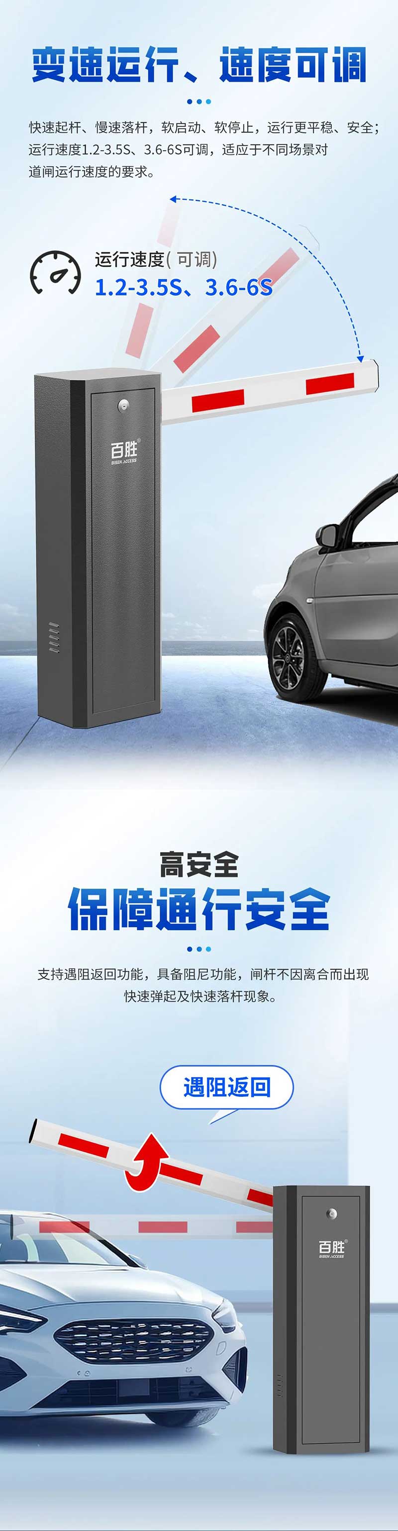 2、變速運行、迪度可調(diào):快速起桿、慢速落桿,軟啟動、軟停止,運行更平穩(wěn)、安全;運行速度1.2-3.5S、3.6-6S可調(diào),適應(yīng)于不同場景對