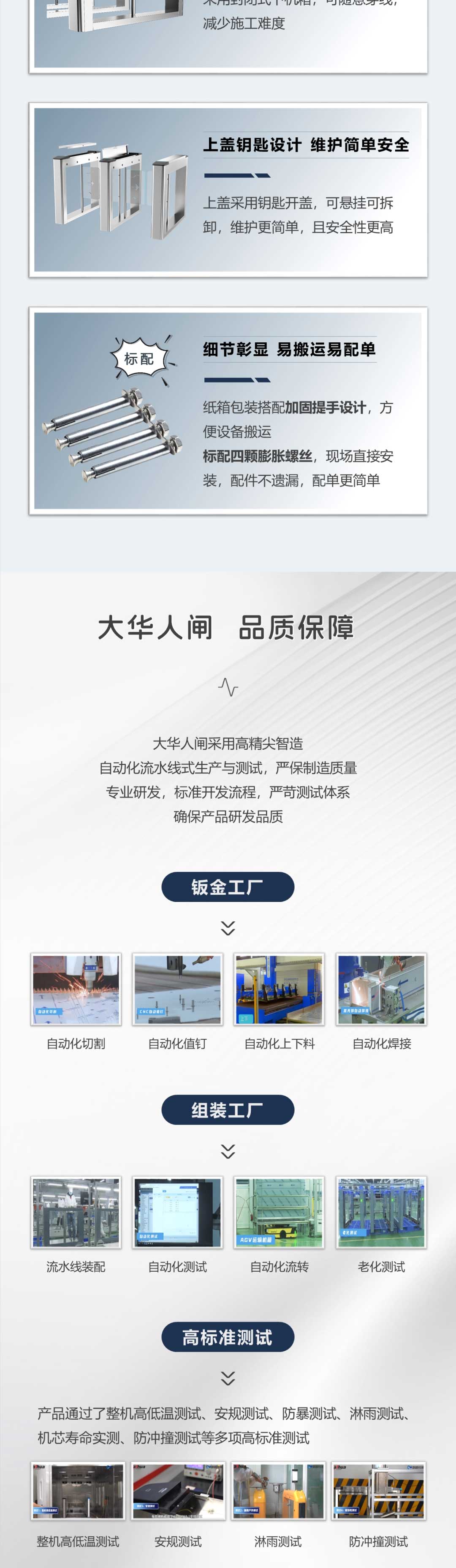 大華人閘品質(zhì)保障:大華人閘采用高精尖智造自動(dòng)化流水線式生產(chǎn)與測(cè)試,嚴(yán)保制造質(zhì)量專業(yè)研發(fā),標(biāo)準(zhǔn)開發(fā)流程,嚴(yán)苛測(cè)試體系確保產(chǎn)品研發(fā)品質(zhì)