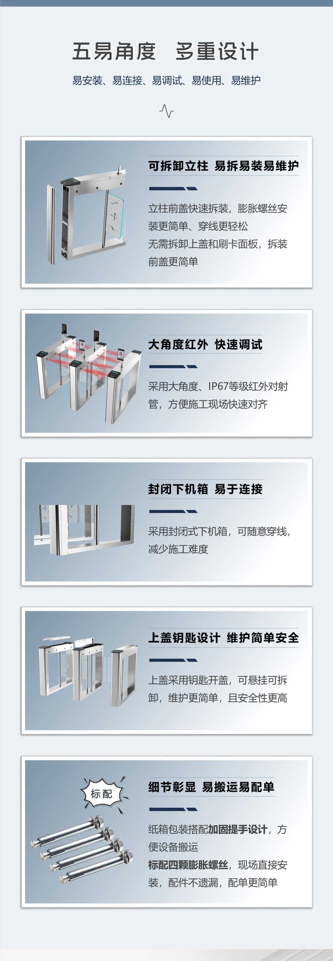 可拆卸立柱 易拆易裝易維護(hù):立柱前蓋快速拆裝,膨脹螺絲安裝更簡單、穿線更輕松無需拆卸上蓋和卡面板,拆裝前蓋更簡單。