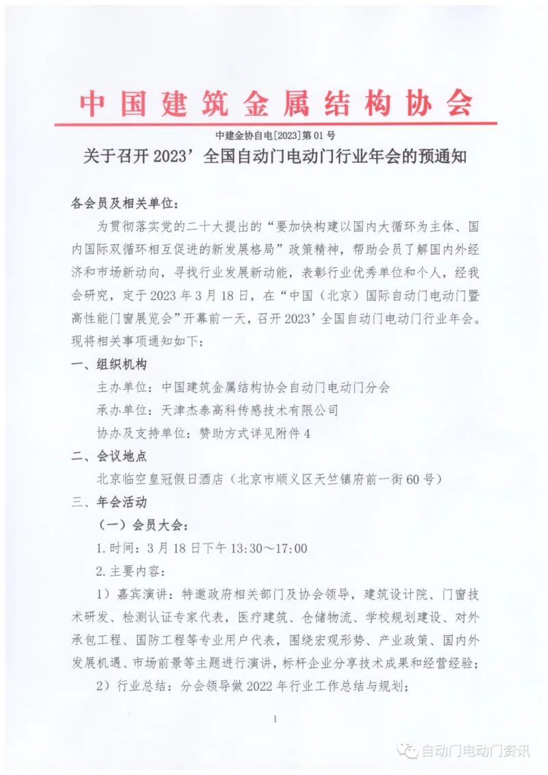 為貫徹落實黨的二十大提出的“要加快構建以國內(nèi)大循環(huán)為主體、國內(nèi)國際雙循環(huán)相互促進的新發(fā)展格局”政策精神,幫助會員了解國內(nèi)外經(jīng)濟和市場新動向,尋找行業(yè)發(fā)展新動能,表彰行業(yè)優(yōu)秀單位和個人,經(jīng)我會研究,定于2023年3月18日,在“中國(北京)國際自動門電動門暨高性能門窗展覽會”開幕前一天,召開2023’全國自動門電動門行業(yè)年會?,F(xiàn)將相關事項通知如下:
