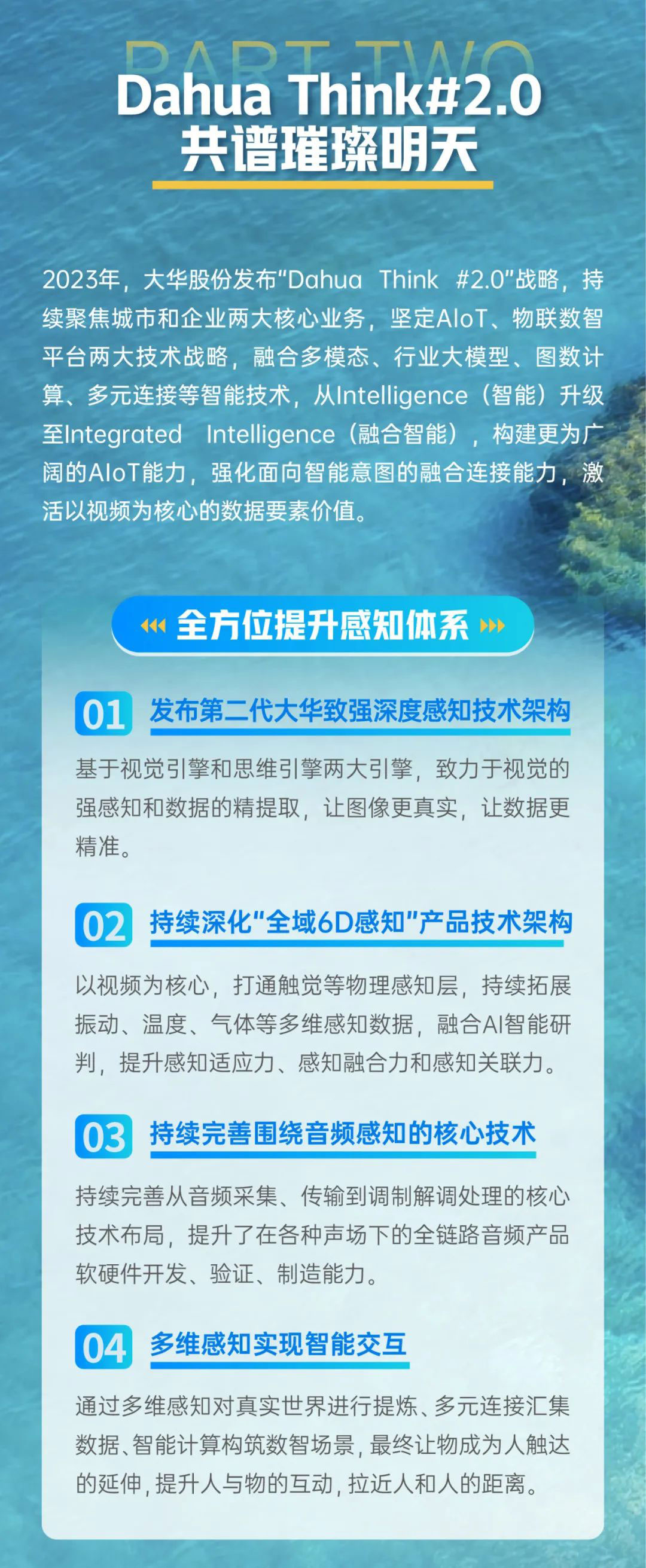 2023年,大華股份發(fā)布"Dahua Think #2.0"戰(zhàn)略,持續(xù)聚焦城市和企業(yè)兩大核心業(yè)務(wù),堅(jiān)定AloT、物聯(lián)數(shù)智平臺(tái)兩大技術(shù)戰(zhàn)略,融合多模態(tài)、行業(yè)大模型、圖數(shù)計(jì)算、多元連接等智能技術(shù),從Intelligence (智能)升級至lntegrated lntelligence(融合智能),構(gòu)建更為廣闊的AIoT能力,強(qiáng)化面向智能意圖的融合連接能力,激活以視頻為核心的數(shù)據(jù)要素價(jià)值。