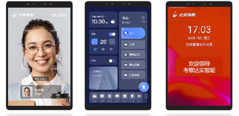 舉一個(gè)例子,達(dá)實(shí)自主研發(fā)的10寸空間場(chǎng)景交互屏,通常門禁產(chǎn)品叫做安防產(chǎn)品,刷臉開門,安全防范。圣賢思想告訴我們,不僅要抑制人的小我,更要激揚(yáng)人心中的大我,所以我們把它變成一個(gè)信息推送的窗口,把安防產(chǎn)品從抵制壞人升級(jí)到歡迎客人,整座大廈就變成了一個(gè)溫暖的空間。