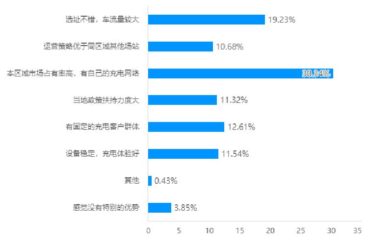 而從“場(chǎng)站是否具備以下優(yōu)勢(shì)”問(wèn)題中,我們也能得出想要打造具備競(jìng)爭(zhēng)力的場(chǎng)站,應(yīng)該考慮的維度。在調(diào)研數(shù)據(jù)中,運(yùn)營(yíng)商場(chǎng)站具備的核心優(yōu)勢(shì)體現(xiàn)為市占率高、選址優(yōu)、運(yùn)營(yíng)策略佳、客群穩(wěn)定、扶持力度大、設(shè)備穩(wěn)定等。