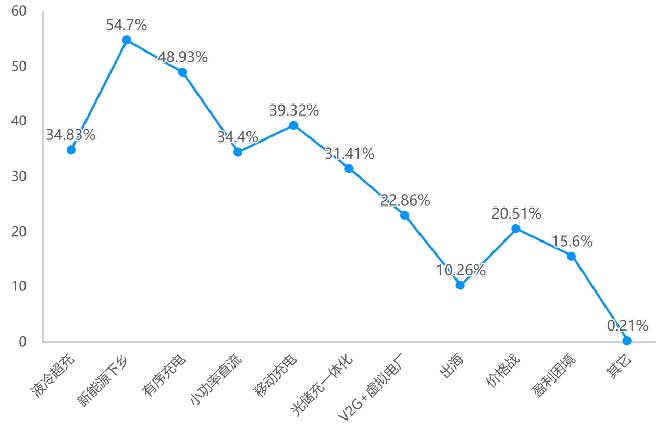 在行業(yè)熱詞的關(guān)注度上,我們列舉了10大熱詞,調(diào)研數(shù)據(jù)結(jié)果顯示,運(yùn)營(yíng)商關(guān)注度從高到低依次為:新能源下鄉(xiāng)、有序充電、移動(dòng)充電、液冷超充、小功率直流、光儲(chǔ)充一體化、V2G+虛擬電廠、價(jià)格戰(zhàn)、盈利困境、出海。其中超過(guò)五成的運(yùn)營(yíng)商在關(guān)注新能源下鄉(xiāng)這一趨勢(shì)。