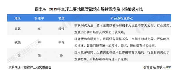 更高比例的單戶住宅,以及消費者對智能家居自動化或安全服務(wù)的更大興趣,使美國成為迄今為止智能鎖最大的市場,其他地區(qū)的消費者有著不同的優(yōu)先級。在西歐,溫度控制更為重要,智能鎖通常不會集成到智能家居服務(wù)中。在韓國,SK電信,韓國電信或LG U-Plus在多住戶單元中安裝的智能家居解決方案通常具有配備商用級電子鎖系統(tǒng)的共享入口。近年來隨著智能鎖技術(shù)的成熟及市場認知度的提升,中國在智能鎖領(lǐng)域已處于全球領(lǐng)先的地位。無論是產(chǎn)品形態(tài),還是功能,亦或是品牌和企業(yè)數(shù)量,中國均已領(lǐng)先于全球大部分國家。