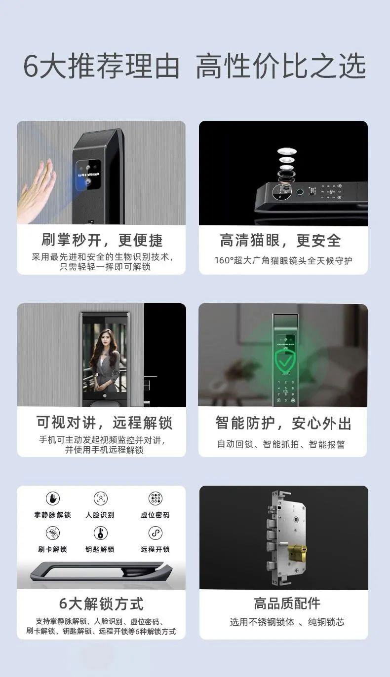 掌秒開(kāi),160度超大廣角高清貓眼,可視對(duì)講,手機(jī)遠(yuǎn)程解鎖,自動(dòng)回鎖,智能抓拍、報(bào)警,支持掌靜脈、人臉識(shí)別、虛位密碼,刷卡解鎖等6種解鎖。