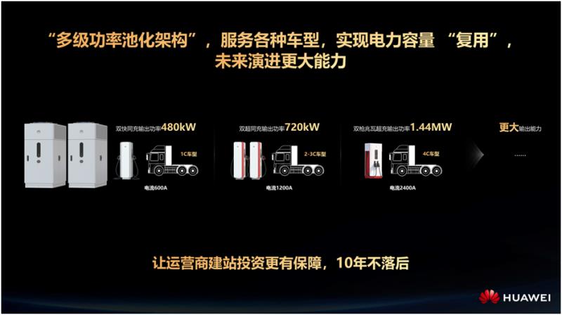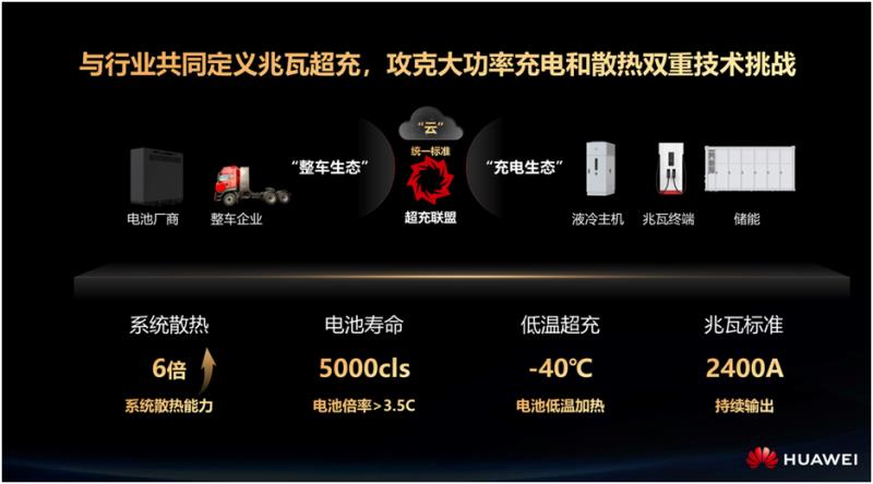 要解決提速需求,實現(xiàn)互聯(lián)互通,整個重卡的上下游還存在很多的斷點,不是單靠一個充電設備廠家就能夠提升它的補能效益。但現(xiàn)在為什么又能做到了呢?是因為當前整個產(chǎn)業(yè)已經(jīng)開始成熟了。首先是我們?nèi)绻a能的時間,從一個小時以上縮短到現(xiàn)在20分鐘、15分鐘以內(nèi),那就需要我們的儲能具備3C~4C以上的大倍率補能能力。現(xiàn)在已經(jīng)有很多的企業(yè),能夠?qū)崿F(xiàn)這樣的大倍率的、長壽命的電池。第二就是受限于整車的散熱,大家知道當電池大倍率充電的時候,它帶來的熱量會激增,如果你不把這個熱散去的話,它可能只能到峰值的,真的所謂的“兆瓦閃充”,到了1兆瓦峰值點幾十秒后馬上就降下來,到幾百千瓦。那就要對整車的散熱系統(tǒng)增加投入,但本身商用車可能在行業(yè)里面大家就認為,它是一個丐幫,本來賣車就是不太賺錢,如果每輛車再增加兩三萬的成本,用戶還有他的購買的欲望嗎,它的競爭力就會大大下降。另外一個就是怎么樣實現(xiàn)充電設備的高功率輸出,還要求在用戶場景高可靠,持續(xù)的兆瓦輸出的能力。所以基于這一點,經(jīng)過兩年時間華為和行業(yè)的生態(tài)伙伴們,整車企業(yè)及電池廠家的努力,我們把這個解決方案在今年的上海車展上推出,華為的全液冷兆瓦超充解決了行業(yè)的挑戰(zhàn),達到6倍的散熱能力,電池的壽命和電池廠家能夠在大倍率充電的時候,在充電過程中把熱散去,保持使用壽命,同時改變一些配方,讓它的循環(huán)壽命增強。另外在低溫場景是當前很多的重卡的作業(yè)場景,在煤礦、礦區(qū)都在北方,通過我們車載的液冷的設備,能夠快速給車上的電池包加溫,能夠讓它在零下四十度環(huán)境下,電池保持在一個零度以上的溫度,這樣的話就能夠?qū)崿F(xiàn)快速的補能。另外提到持續(xù)的雙槍2400A的兆瓦輸出,當然這個還只是當前我們給行業(yè)提出的能力標桿,我們現(xiàn)在這個能力在實驗室里面,已經(jīng)達到了單槍的2000A,意味著雙槍的4000A是未來可持續(xù)發(fā)展演進的。