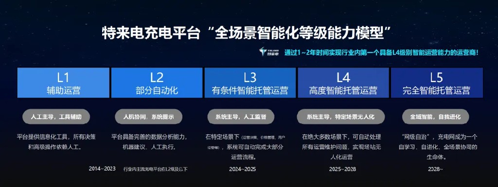 特來電定義了充電平臺L1-L5“全場景智能化等級能力模型”。行業(yè)內(nèi)主流充電平臺在L2級及以下,而特來電通過借助AI大模型,實現(xiàn)了L3(有條件智能托管運營),同時在新一代充電網(wǎng)數(shù)字化充電平臺下,通過1-2年時間將實現(xiàn)行業(yè)內(nèi)第一個具備L4級別智能運營能力,為客戶提供通往L5級無人值守運營的最優(yōu)路徑,線下場站全自動,線上運營全智能。