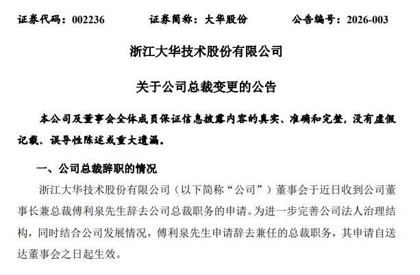 1月5日,大華股份宣布,傅利泉辭去總裁職位。經董事長傅利泉先生提名、公司董事會提名委員會任職資格審查通過,公司董事會同意聘任趙宇寧先生為公司總裁。