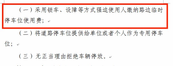 對于車位管理方管理亂象,進(jìn)一步強(qiáng)調(diào)道路停車管理人員不得采用鎖車、設(shè)障等方式強(qiáng)迫使用人繳納路邊臨時(shí)停車位使用費(fèi);或無正當(dāng)理由拒絕車輛停放。