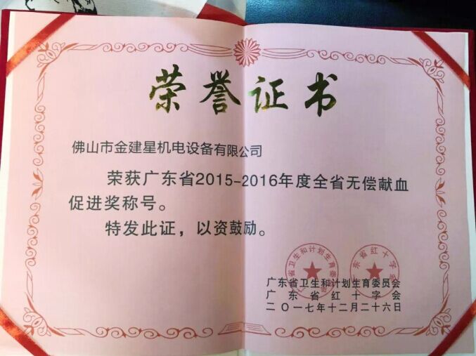 6月29日,廣東省佛山市政府舉行了以“為他人著想,捐獻(xiàn)熱血,分享生命”為主題的世界獻(xiàn)血者日活動?;顒由希鸾ㄐ枪炯岸麻L黃錦山分別榮獲單位和個人的廣東省無償獻(xiàn)血促進(jìn)獎稱號。據(jù)了解,金建星智能科技有限公司連續(xù)八年,每年都自發(fā)組織無償獻(xiàn)血行動,黃錦山董事長以身作則,帶領(lǐng)著全公司員工及家人踴躍參與無償獻(xiàn)血行動。