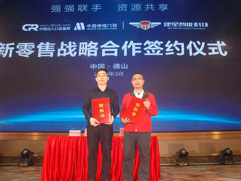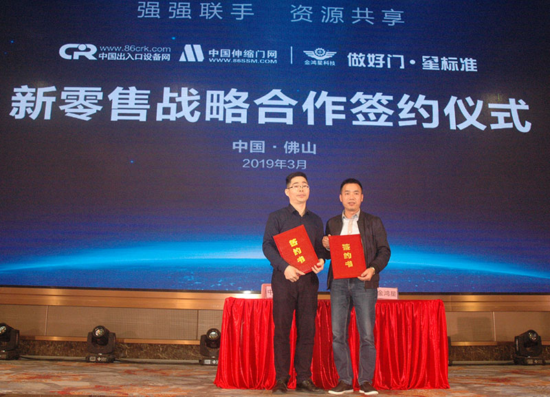 3月3日,中出網(wǎng)&中國(guó)伸縮門網(wǎng)在佛山舉行“強(qiáng)強(qiáng)聯(lián)手,資源共享”新零售戰(zhàn)略合作簽約儀式。中國(guó)建筑金屬結(jié)構(gòu)協(xié)會(huì)自動(dòng)門電動(dòng)門分會(huì)潘冠軍會(huì)長(zhǎng)、林夕范副會(huì)長(zhǎng)、佛山市自動(dòng)門行業(yè)協(xié)會(huì)羅明輝會(huì)長(zhǎng)、中出網(wǎng)&中國(guó)伸縮門網(wǎng)李明發(fā)董事長(zhǎng)、佛山金鴻星智能科技有限公司金國(guó)建董事長(zhǎng)和黃笑群總經(jīng)理、江蘇華龍鼎門業(yè)科研有限公司韓立軍董事長(zhǎng)、佛山市金建星智能科技有限公司黎圖總經(jīng)理等出席簽約儀式。