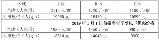 注:標(biāo)準(zhǔn)展位最小租用面積為9㎡ 光地最小租用面積為36㎡。標(biāo)準(zhǔn)展位配置包含展三面圍板、洽談桌一張、椅子兩張、射燈兩盞、中英文雙語楣板一條、220V電源插座一個(限500W內(nèi)用電);光地不含基本配置。