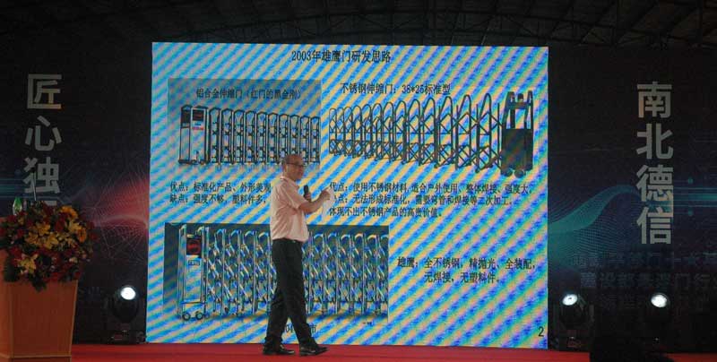 南北德信20多年來(lái)一直引領(lǐng)電動(dòng)門(mén)行業(yè)的創(chuàng)新?;舳跁?huì)上分享了南北德信創(chuàng)新路上的成功與失敗。2003年,研發(fā)出全不銹鋼精拋伸縮門(mén):雄鷹門(mén),解決了伸縮門(mén)塑料配件容易老化的問(wèn)題,時(shí)至今日,雄鷹門(mén)仍是市場(chǎng)熱銷產(chǎn)品。 2007年,自主研發(fā)出第二代電動(dòng):懸浮平移門(mén),突破了伸縮門(mén)的安全和防盜問(wèn)題,大大降低了電動(dòng)門(mén)的故障率,是目前市場(chǎng)的支柱產(chǎn)品。2011年,研發(fā)出第三代電動(dòng)門(mén):懸浮折疊門(mén),是目前庭院別墅等較窄大門(mén)口的熱門(mén)高端產(chǎn)品。2015年研發(fā)出無(wú)軌平移門(mén),解決了傳統(tǒng)平移門(mén)經(jīng)常脫齒的痛點(diǎn),2017年,再次研發(fā)出多片聯(lián)動(dòng)的第二代分段電動(dòng)門(mén)--凱歌,解決了一代分段平移門(mén)上供電線易斷、開(kāi)關(guān)門(mén)慢的痛點(diǎn)。2018年董事長(zhǎng)霍志文先生榮獲全國(guó)性行業(yè)協(xié)會(huì)頒發(fā)的行業(yè)功勛人物獎(jiǎng)。