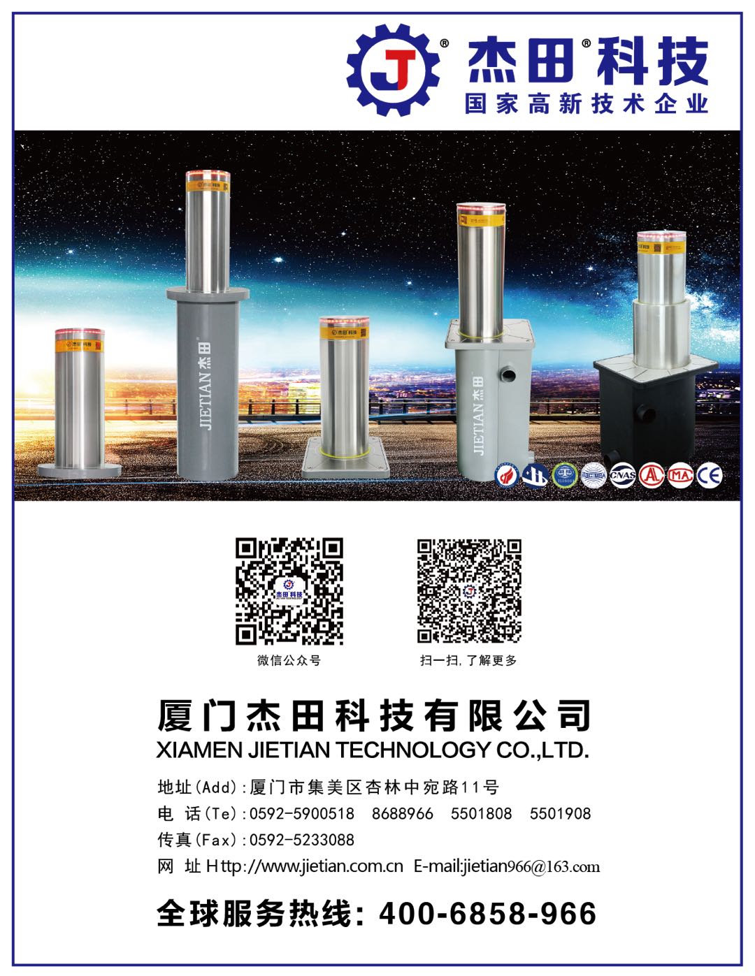 杰田科技是一家集升降柱、路障機、破胎器等反恐防爆設施的研發(fā)、設計、生產(chǎn)及銷售于一體的綜合型現(xiàn)代專業(yè)化企業(yè),產(chǎn)品已率先通過公安部認證、歐盟CE認證、GB/T24001-2016/ISO14001:2015環(huán)境管理體系認證、GB/T28001-2011/OHSAS18001:2007職業(yè)健康安全管理體系認證、ISO9001質(zhì)量管理體系認證等多項國家權(quán)威質(zhì)量檢測。