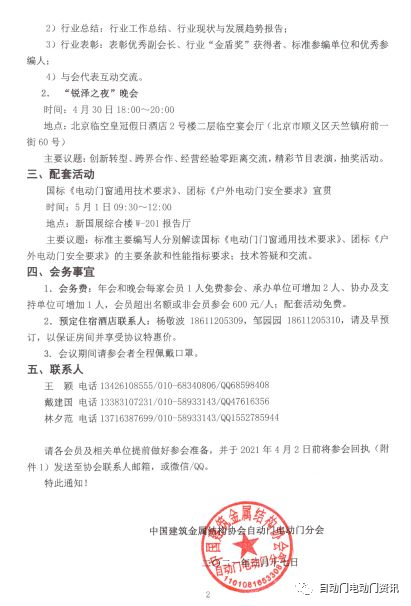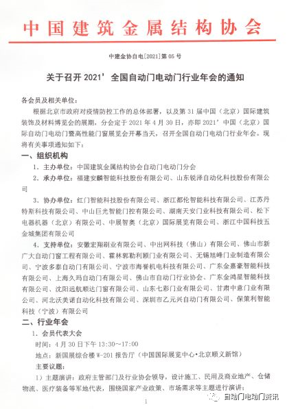 根據(jù)北京市政府對疫情防控工作的總體部署,以及第31屆中國(北京)國際建筑裝飾及材料博覽會的展期,分會定于2021年4月30日,亦即2021’中國(北京)國際自動門電動門暨高性能門窗展覽會開幕當天,召開全國自動門電動門行業(yè)年會?,F(xiàn)將有關(guān)事項通知如下: