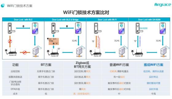 在目前智能鎖解決方案中,Zigbee、WiFi,或BT是最常見(jiàn)的智能鎖協(xié)議方案。Zigbee或BT網(wǎng)關(guān)方案,安裝麻煩,成本偏高;普通的WiFi方案,功耗高,在遠(yuǎn)程控制體驗(yàn)、狀態(tài)查詢、OTA升級(jí)等方面,劣勢(shì)較為明顯。