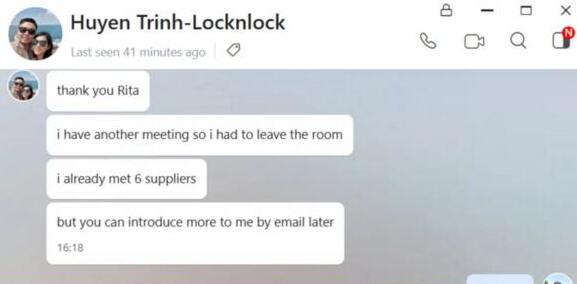 來自越南Lock n Lock公司的買家表示,在此次線上展會已經(jīng)和6個供應(yīng)商進行洽談.