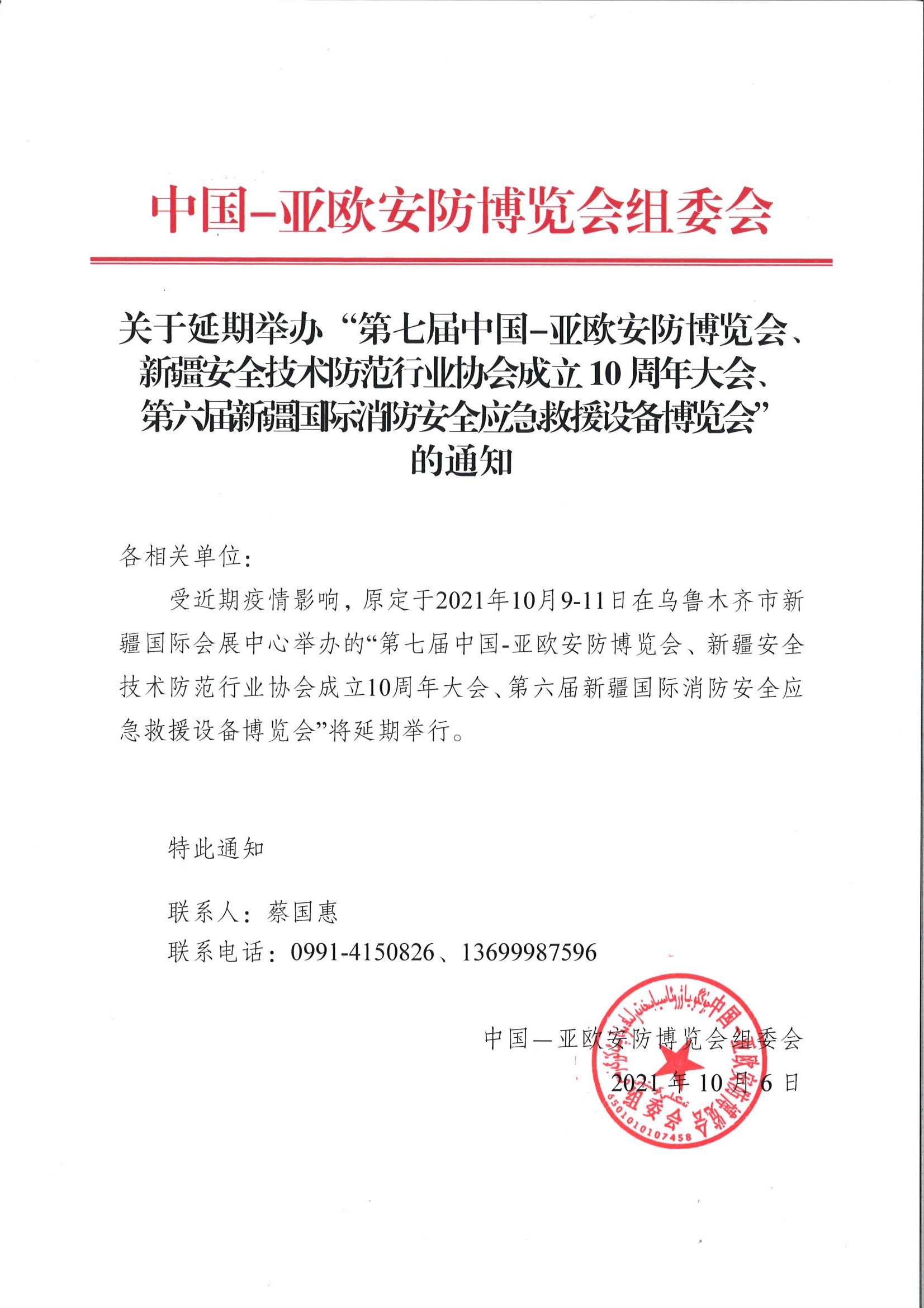 關(guān)于延期舉辦“第七屆中國(guó)一亞歐安防博覽會(huì)、新疆安全技術(shù)防范行業(yè)協(xié)會(huì)成立10周年大會(huì)、第六屆新疆國(guó)際消防安全應(yīng)急救援設(shè)備博覽會(huì)”的通知