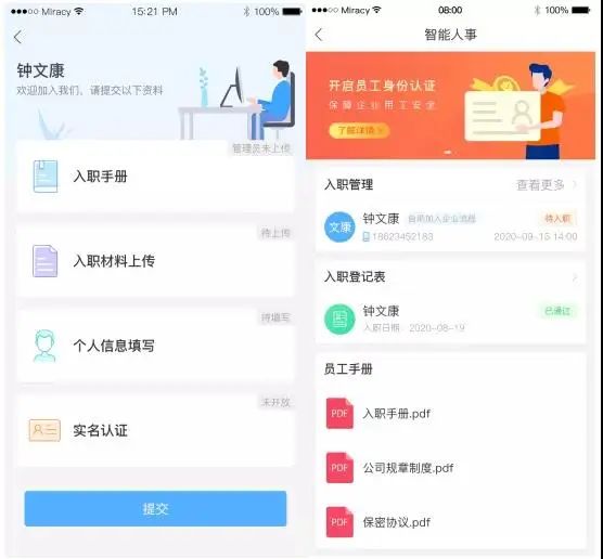 自助入職。ZKTeco+支持全程線上自助入職流程,員工使用ZKTeco+app完成入職文件簽署、入職材料上傳、個(gè)人信息錄入以及實(shí)名認(rèn)證,HR在線完成入職審批,輕松應(yīng)對(duì)人快速入職,提升工作效率及工作體驗(yàn)。