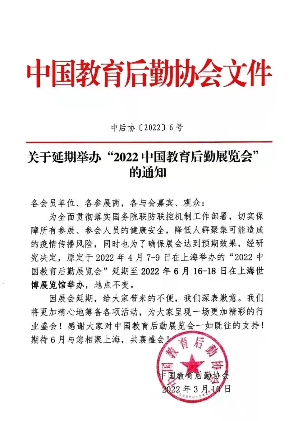 為全面貫徹落實(shí)國務(wù)院聯(lián)防聯(lián)控機(jī)制工作部署,切實(shí)保障所有參展、參會人員的健康安全,降低人群聚集可能造成的疫情傳播風(fēng)險(xiǎn),同時(shí)也為了確保展會達(dá)到預(yù)期效果,經(jīng)研究決定,原定于2022年4月7-9日在上海舉辦的“2022中國教育后勤展覽會”延期至2022年6月16-18日在上海世博展覽館舉辦,地點(diǎn)不變。