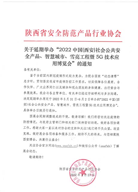 為配合國家“動(dòng)態(tài)清零”總方針,貫徹落實(shí)省市疫情防控工作要求,切實(shí)保障各位展商、合作伙伴、廣大業(yè)界同仁以及媒體和觀眾朋友的身體健康、出行安全與參展效果,2022中國(西安)社會(huì)公共安全產(chǎn)品、智慧城市、雪亮工程暨5G技術(shù)應(yīng)用博覽會(huì)與各主管單位、有關(guān)單位經(jīng)過仔細(xì)研判與多方溝通,決定延期舉辦原定于2022年5月31日-6月2日舉辦的“2022中國(西安)社會(huì)公共安全產(chǎn)品、智慧城市、雪亮工程暨5G技術(shù)應(yīng)用博覽會(huì)”,具體舉辦日期另行通知。