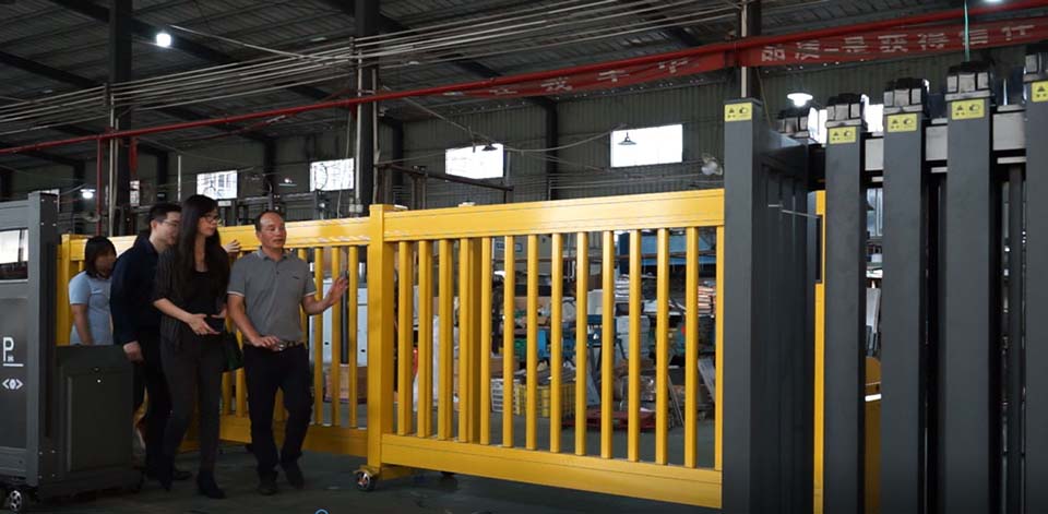 探訪團一行來到勇創(chuàng)科技生產(chǎn)中心,仔細觀察電動門等產(chǎn)品的材質(zhì)、厚度和外觀,并觀看了工人的制作流程。一段黃色的電動平移門引起了探訪團的注意,不同于以往我們認識的灰白黑,這款電動平移門以靚麗的黃色烤漆而成,謝總說,從工藝技術(shù)來說,黃色烤漆需要更高的溫度,調(diào)色很考究,非常適合用在活潑的校園環(huán)境。