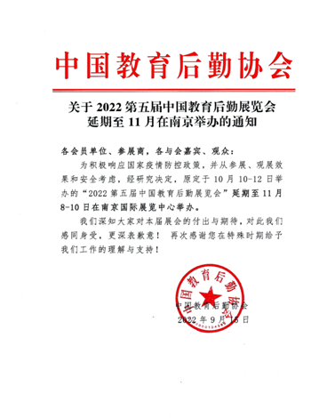 為積極響應(yīng)國家疫情防控政策,并從參展、觀展效果和安全考慮,經(jīng)研究決定,原定于10月10-12日舉辦的“2022第五屆中國教育后勤展覽會(huì)”延期至11月8-10日在南京國際展覽中心舉辦。