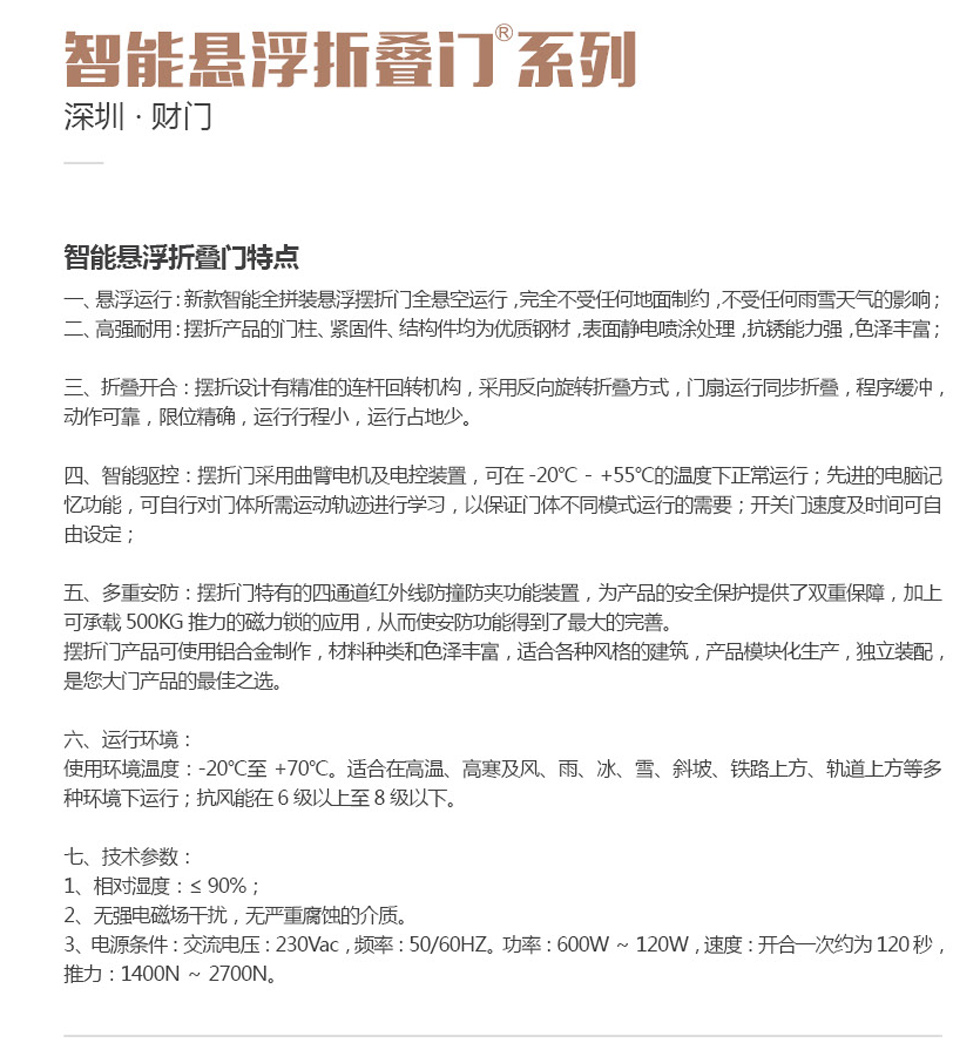 一、懸浮運(yùn)行:新款智能全拼裝懸浮擺折門全懸空運(yùn)行,完全不受任何地面制約,不受任何雨雪天氣的影響;