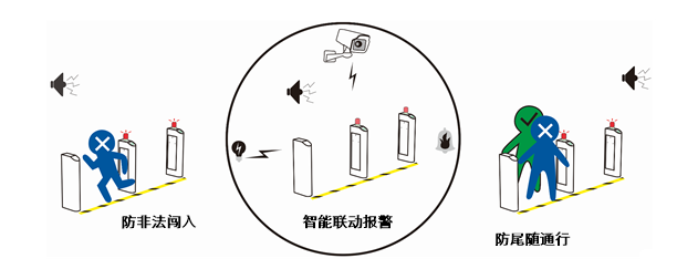 閘機(jī)的報(bào)警功能:行人非法闖入、尾隨通行時(shí),蜂鳴器應(yīng)報(bào)警提示