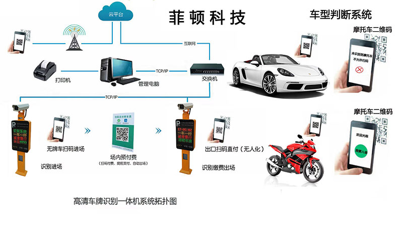 3、無人值守車場加裝車型判斷系統(tǒng):臨停摩托車掃碼進(jìn)出自助繳費(fèi),無牌小車無法掃摩托車碼入場。