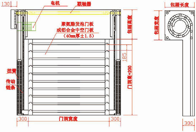硬質(zhì)快卷門主要由軌道、門板部件、扭簧、傳動(dòng)鏈條、電機(jī)、控制系統(tǒng)等組成。