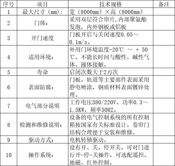 4、電機(jī):采用卷簾門(mén)專用一體化電機(jī),具有過(guò)熱保護(hù)功能,開(kāi)門(mén)速度0.1~0.2m/s。
