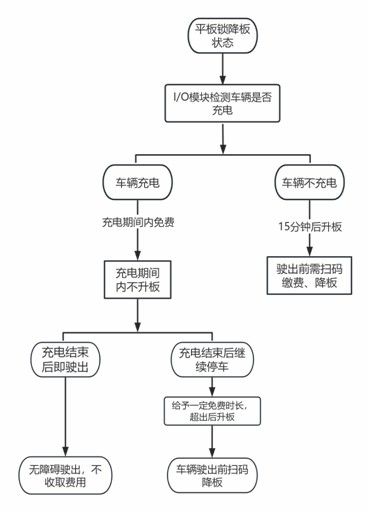 通過平臺充電信息(或I/O模塊檢測)來判斷車輛充電,充電期間內(nèi)不升板;充電結(jié)束后,給予一定免費時長,超出該免費時長后,升板計費,駛離需掃碼付費降鎖;