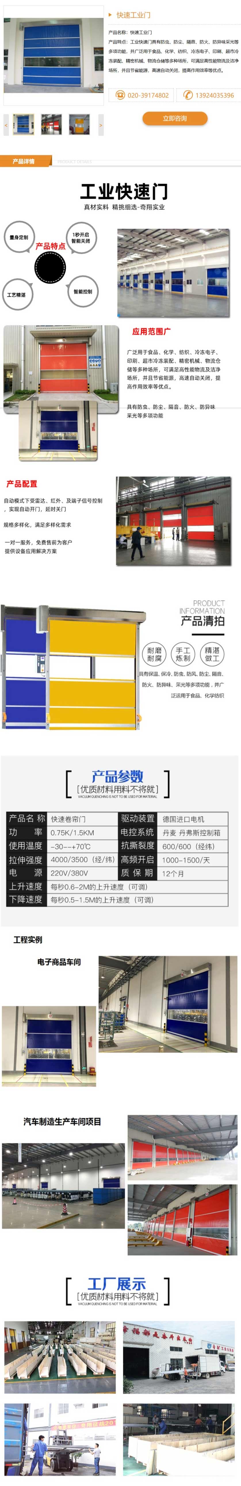 產(chǎn)品特點(diǎn):工業(yè)快速門具有防蟲、防塵、隔音、防火、防異味采光等多項(xiàng)功能,并廣泛用于食品、化學(xué)、紡織、冷凍電子、印刷、超市冷凍裝配、精密機(jī)械、物流倉儲等多種場所,可滿足高性能物流及潔凈場所,并且節(jié)省能源,高速自動關(guān)閉,提高作用效率等優(yōu)點(diǎn)。