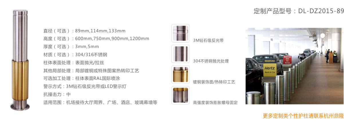 杭州鼎隆針對各區(qū)域景觀需求提供89mm、102mm、114mm、133mm等直徑的各類固定景護柱。FE、SS304、SS316及各種復合材料、各種管壁厚度、各種柱體及頂蓋設計的固定景觀護柱供客戶及設計單位選擇。在配套區(qū)域美觀的基礎上,同時亦能滿足區(qū)域周界的區(qū)域界定與防沖撞的要求。