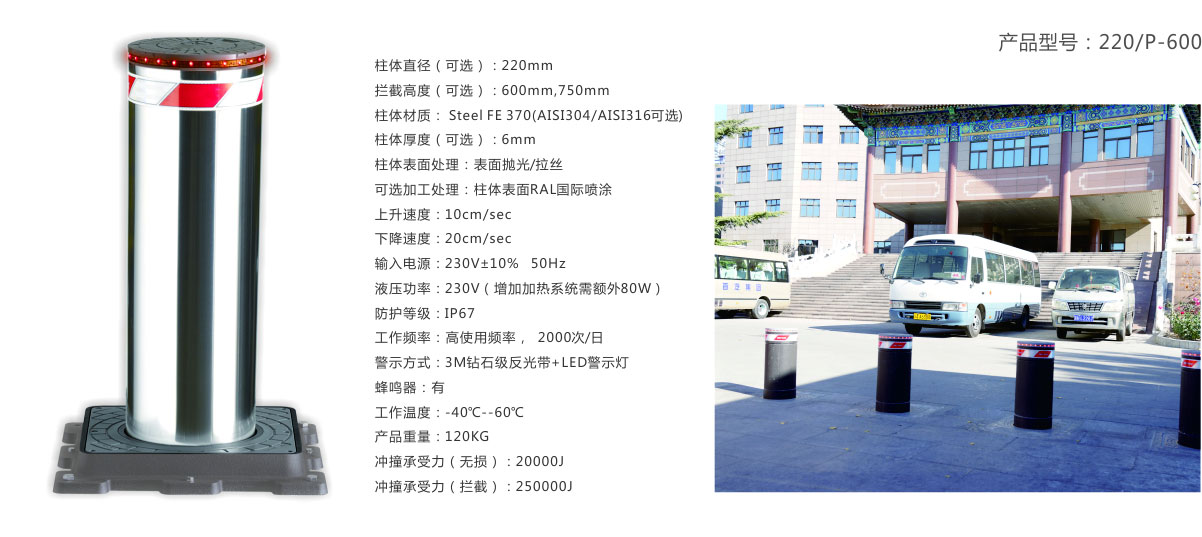 液壓式全自動(dòng)護(hù)柱用于滿(mǎn)足高安全性通道管制需求,應(yīng)用于政府、電站、軍需倉(cāng)庫(kù)、機(jī)場(chǎng)等場(chǎng)所。采用的液壓動(dòng)力系統(tǒng),根據(jù)獨(dú)立性應(yīng)用及高頻率高安全性應(yīng)用的不同需求,分別對(duì)應(yīng)內(nèi)置液壓總成和外置液壓?jiǎn)卧獌煞N結(jié)構(gòu),其動(dòng)力單元?jiǎng)恿Τ渑?、運(yùn)行穩(wěn)定,流體速度快,配備于高安全性反恐護(hù)柱使用,升降速度可達(dá)到10cm/s,通過(guò)加裝液壓蓄能裝置(Accumulator),甚至可以實(shí)現(xiàn)突發(fā)狀況下1.5s快速升起阻截的應(yīng)急響應(yīng)。