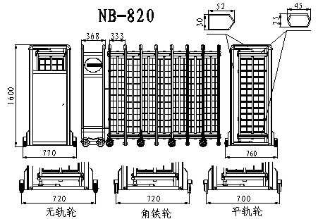 南北德信NB-820不銹鋼伸縮門門體采用公司自行加工優(yōu)質(zhì)不銹鋼和鋁型材等材料制作,主框架采用立體四維平行原理鉸接,伸縮靈活。伸縮門主要由門體、驅(qū)動(dòng)器、控制系統(tǒng)構(gòu)成。驅(qū)動(dòng)器采用特種電機(jī)驅(qū)動(dòng),蝸輪蝸桿減速,并設(shè)有手動(dòng)離合器,停電時(shí)可手動(dòng)啟閉,控制系統(tǒng)有臺(tái)控及遙控兩種??膳鋫錆L動(dòng)顯示屏,顯示個(gè)性文字內(nèi)容。還可選配備智能紅外線探頭防碰撞裝置,運(yùn)行時(shí)遇人或異物20-30CM可自動(dòng)返回運(yùn)行,從而保障車輛及行人的安全。適用于工礦企業(yè)、機(jī)關(guān)院校、娛樂場(chǎng)所、賓館飯店等庭院圍墻門。起到美化環(huán)境、改善企業(yè)面貌、提升企業(yè)形象;有助于營造文明社會(huì)、文明企業(yè)、文明城市氣氛;
