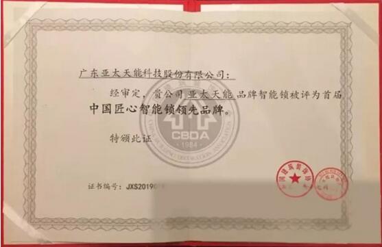 7月8日,亞太天能再次斬獲由中國建筑裝飾協(xié)會頒發(fā)的“ 2019中國匠心智能鎖領(lǐng)先品牌”榮譽。