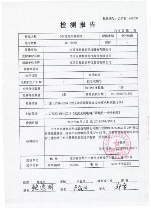 在公安三所的權(quán)威檢驗(yàn)下,百勝36V直流無刷升降地柱符合“GB 16796-2009《安全防范報(bào)警設(shè)備安全要求和試驗(yàn)方法》及Q/BSZN 014-2018《直流無刷電動(dòng)升降地柱-企業(yè)標(biāo)準(zhǔn)》”要求。