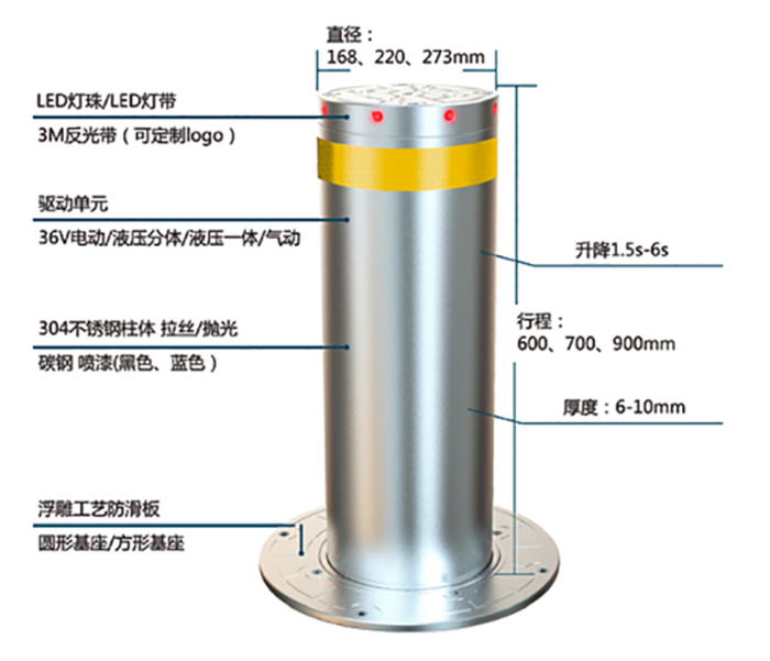 眾所周知,升降柱為控制車(chē)輛通行的設(shè)備。其主要是為敏感區(qū)域阻止非允許車(chē)輛強(qiáng)行闖入而設(shè)計(jì)研發(fā)的,具有較高的實(shí)用性、可靠性及安全性。在監(jiān)獄、銀行、政府貴賓通道、學(xué)校等地被廣泛應(yīng)用。