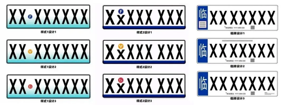 從公布的資料來看,新型號牌蘊含的信息比以往的車牌更多。兩類小型汽車號牌顏色分別有白底藍條黑字和白底藍條漸變黑字,號段共有8個,同時增加了圓形字母圖案,分別有藍、橙、紅三種顏色且內含“F”、“Y”、“G”三個字母。另外,臨時行駛車號牌為左側藍底白字的“臨”字,右側號段有7個,白底黑字,同時帶有二維碼。