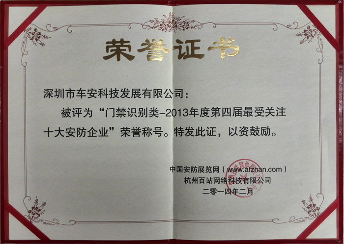 車安科技作為安防一卡通優(yōu)秀供應商及領導者,榮獲“2013年最受關注十大安防企業(yè)”榮譽,車安科技作為《GA/T 761-2008 停車庫(場)安全管理系統(tǒng)技術要求》、《GA/T 992-2012 停車庫(場)出入口控制設備技術要求》等國家停車場行業(yè)標準制訂企業(yè),繼續(xù)專注于安防一卡通產品創(chuàng)新。車安一直堅持“以科技為動力,以質量求發(fā)展”的質量方針,奉行“科技創(chuàng)新、信譽第一、顧客至上”的經營方針,樹立“預防為主,安全生產;以人為本,健康生活;遵紀守法,持續(xù)改進”的職業(yè)健康安全方針。注重建立專業(yè)品牌,不斷完善產品售后服務體系,設立24小時服務熱線,隨時隨地竭誠為廣大用戶服務。把創(chuàng)立具有國際競爭力的中國品牌作為己任,處處以最高標準要求自己,由此贏得了廣大用戶的贊譽,不斷擴大在中國停車場智能化領域的影響力,并逐漸發(fā)展壯大成為領航中國安防行業(yè)的龍頭企業(yè)。