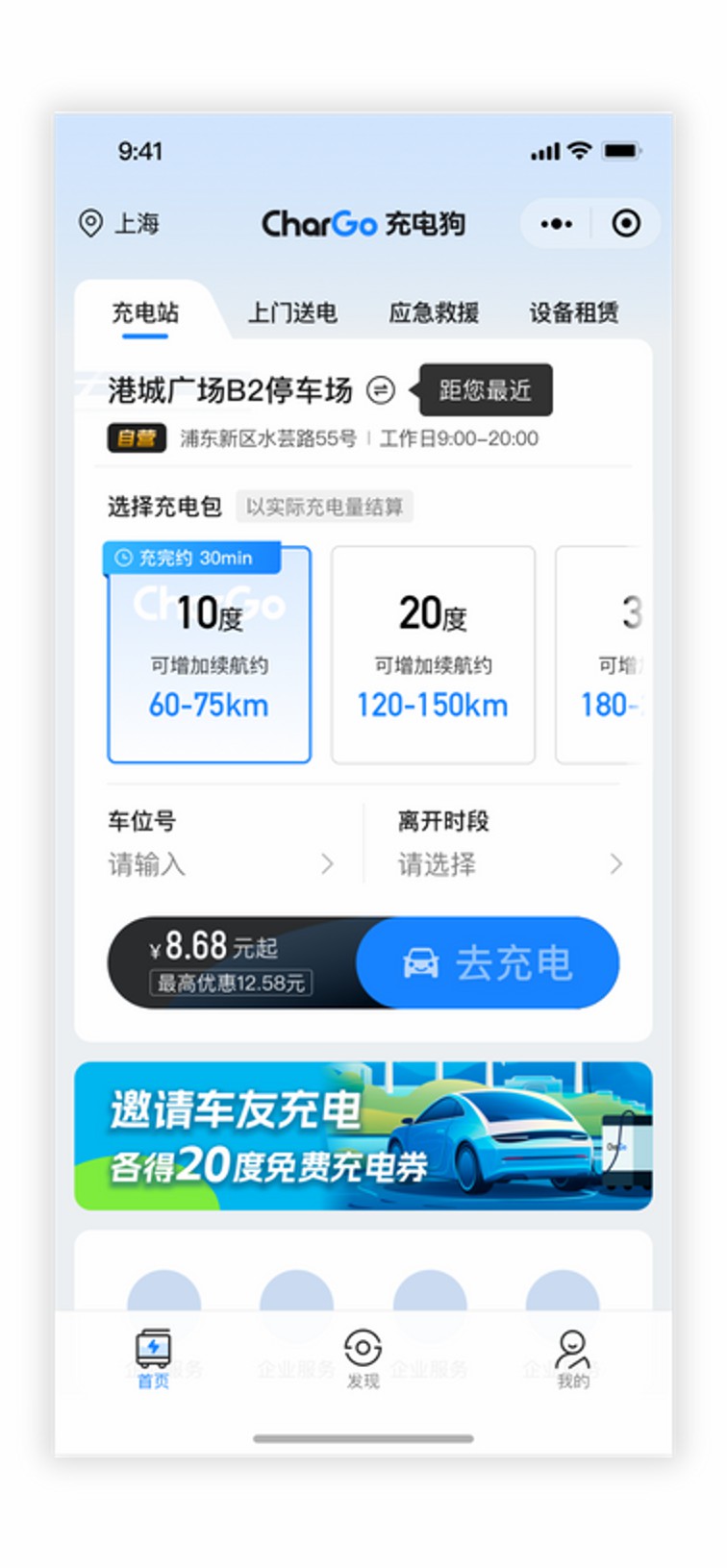 充電狗提供20kw的快充服務(wù),補(bǔ)電半小時(shí),續(xù)航百公里!