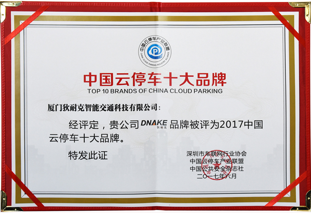狄耐克智能交通榮獲“2017中國云停車十大品牌”稱號