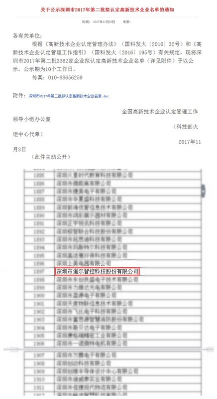 近日,全國高新技術企業(yè)認定管理工作領導小組辦公室發(fā)布了《關于公示深圳市2017年第二批擬認定高新技術企業(yè)名單的通知》,道爾智控再次入選國家級高新技術企業(yè)!