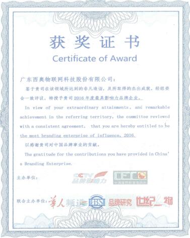 2016年“最具影響力品牌企業(yè)”獲獎(jiǎng)證書