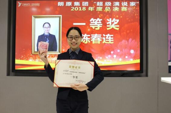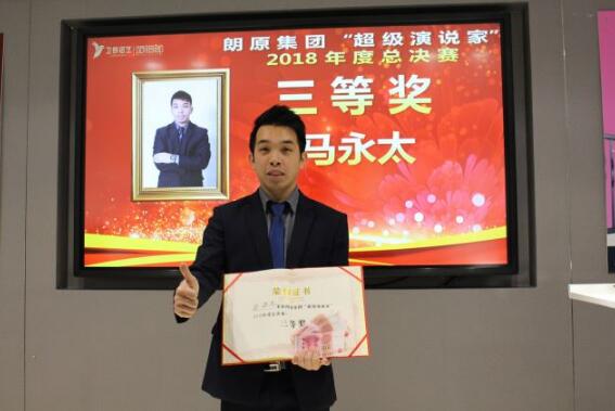 吳為杰副總和許成業(yè)老師為陳春連頒發(fā)2018年度“超級演說家”總決賽一等獎證書和獎金