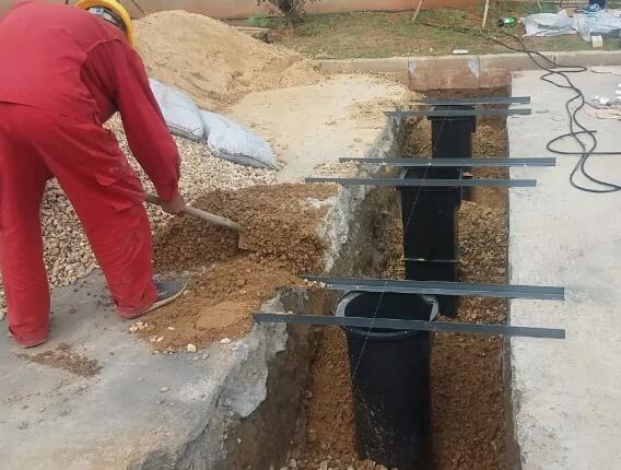 回填砂石,回填至距離地面30cm左右,澆水沉降2小時(shí)候后夯實(shí)。