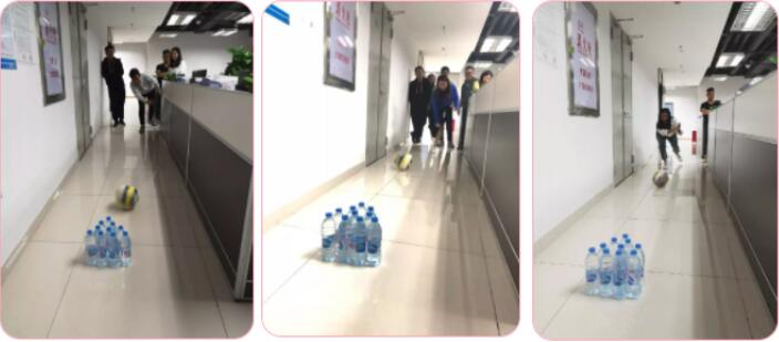 趣味保齡球:這個項目應該是保齡球的“低配版”,最大的優(yōu)點是取材方便,找10個飲料瓶擺放成正三角形,游戲就可以開始了。當選手手持排球站在劃定的警戒線外,目標清晰簡單,手法要求“快準狠“,一擊必中,一中便”開花結果”,瓶子應聲倒地,大家一片歡呼。